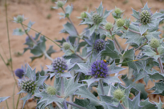 Sea Holly (Eryngium maritimum) growing in the wild.