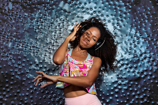 young black afro woman with headphones dancing inspired by the beat of the music