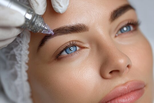 Young woman receiving laser treatment for permanent makeup correction at a salon