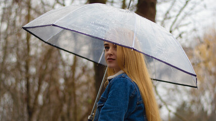 young girl with umbrella walking in at beautifu autumn park. modern girl in casual clothes walks through the city park. Seasonal style, autumn beauty. autumn season, in a blue jacket, in autumn leaves