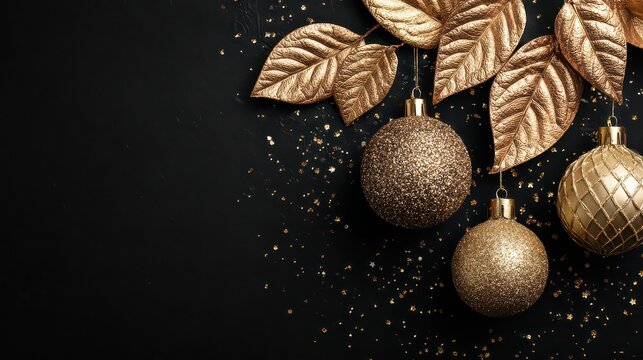 Elegant Christmas Ornaments and Glittering Leaves on Dark Background with Golden Hues