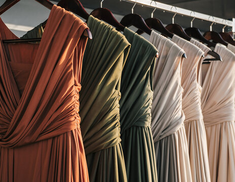 A lineup of lengthy gowns in neutral earthly hues, including terracotta, olive green, beige, and cream, hung elegantly on hangers. Each full-length dress exudes refined elegance, crafted from beautifu
