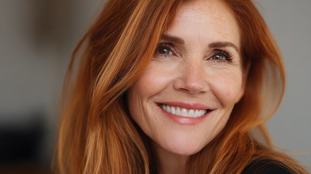 portrait of smiling mature woman looking at camera with big grin successful middle aged woman at home smiling beautiful mid adult lady with long red hair enjoying whitening teeth treatment no logos n