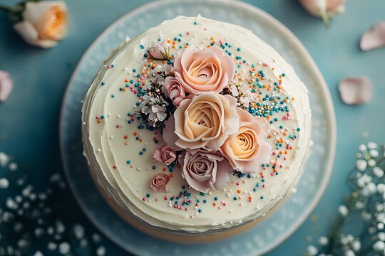 birthday cake top view with Colorful frosting,  and decoration. detailed , texture of sprinkles and icing, isolated dessert, new beautiful stock image illustration AI