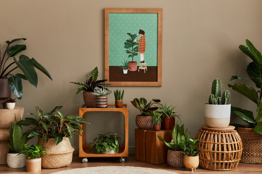Coziness and style. Modern event design. Table setting at wedding reception. Floral compositions with beautiful ranunculus flowers and greenery, candles, laying and plates on decorated table.