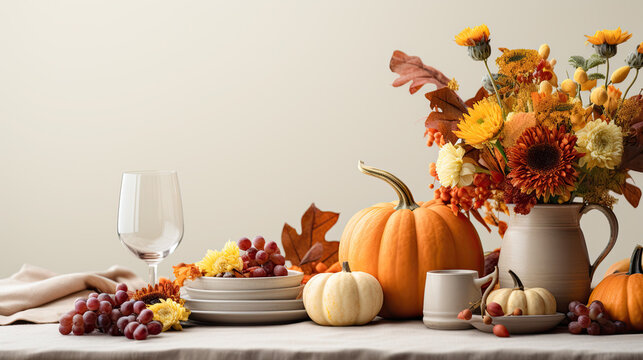 A vase of flowers,a jack pumpkin and candles on a tray. In the background - the interior of a white kitchen in Scandi style. The concept of home and comfort. Autumn decor for the Halloween holiday.