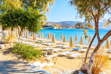 Umbrellas and chairs on beautiful Amopi beach, Karpathos island, Greece
