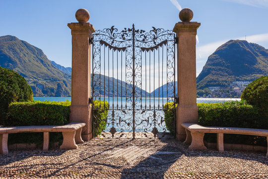 Panorama view of the lake Lugano, mountains and city Lugano, Ticino canton, Switzerland. Scenic beautiful Swiss town with luxury villas. Famous tourist destination in South Europe