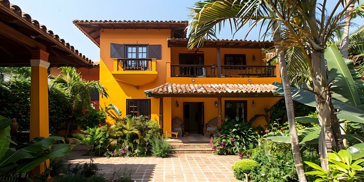 A beautiful colonial house with a yellow exterior and a red tile roof.