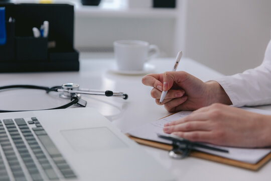 Completing intake form in calming clinic reception, woman holding pen filling paperwork