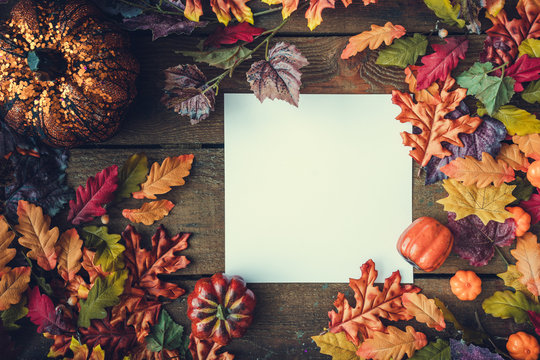 Creative autumn Halloween layout with various leaves and pumkins on dark wooden backgound. Flat lay.