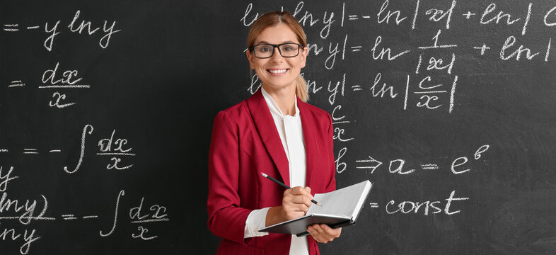 Young math’s teacher writing mathematical equations near chalkboard in classroom