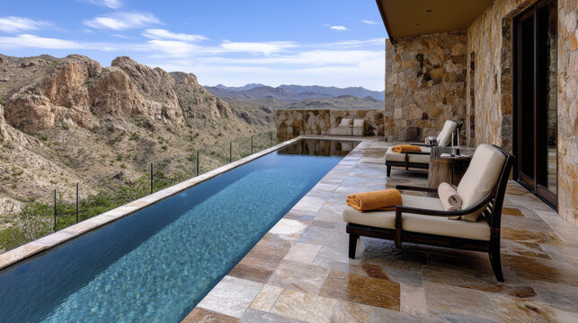 Luxurious infinity pool overlooking rocky mountains and desert landscape