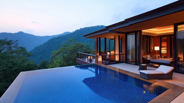 Luxurious villa with stunning infinity pool overlooking lush mountains, featuring modern outdoor furniture and serene ambiance. Perfect for relaxation and tranquility