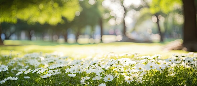 In the sprawling park, nestled among the lush green grass, a beautiful white flower blooms, its textured petals showcasing the beauty of nature in the summer season, a testament to the growth and