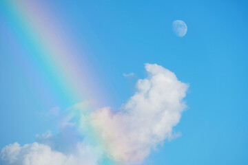 Stunning blue sky panoramic rainbow big fluffy clouds with a giant arcing rainbow against a beautiful summer time blue sky with copy space for messages. rainbow over fields under a blue sky with white