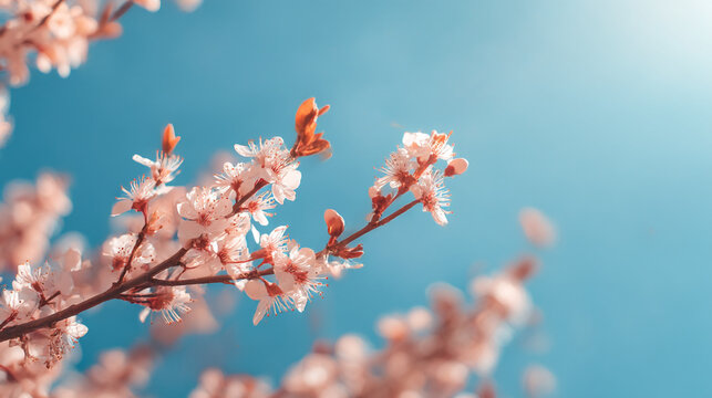 Beautiful spring cherry blossom tree branch against blue sky floral nature photography background image