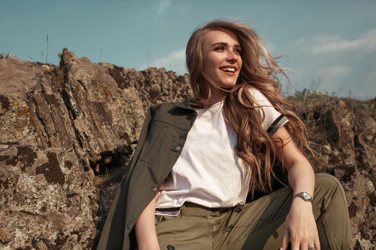High fashion portrait of stylish beautiful woman in trendy jackets and jeans posing outdoor. Vogue style.