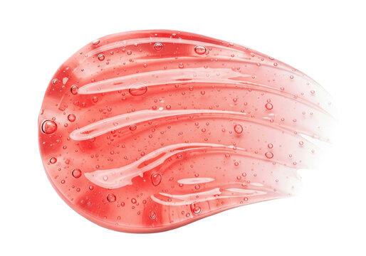 extreme close-up of vibrant coral pink viscous cosmetic gel swatch, exhibiting glossy ridges and air bubbles against a transparent background. concept for luxury beauty product advertising