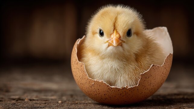 A small chick is emerging from a cracked eggshell, surrounded by a rustic wooden backdrop. The moment signifies new beginnings and the beauty of nature in spring.
