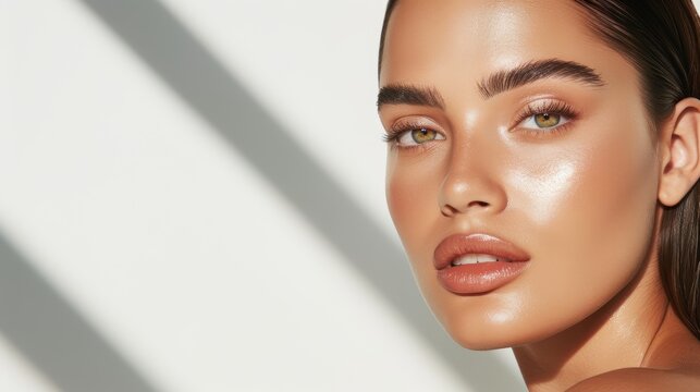 A beauty model with glowing skin, her hair styled in a sleek, simple updo, high-resolution photo, realistic photo, hyper realistic