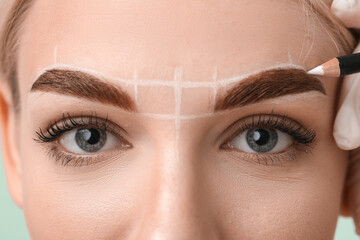 Young woman undergoing eyebrow correction procedure, closeup