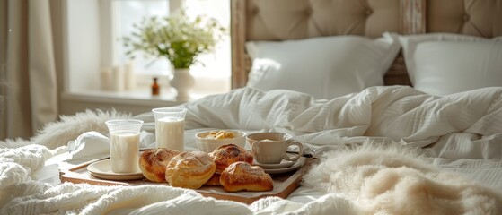 A luxurious breakfast in bed setup with a simple tray and elegant food presentation
