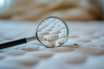 Close-up view of a bed bug on a mattress in a cozy bedroom during daylight hours
