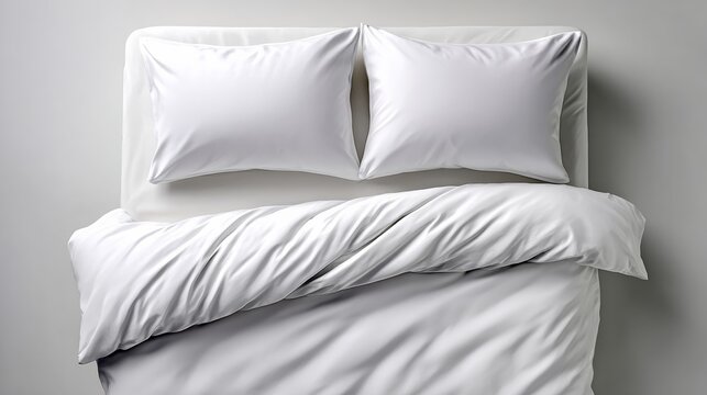 Blank white bed mock up, top view isolated, 3d rendering. Empty blanket and pillows mockup in bedstead. Doss with mattress and bedsheet in place for sleep template. Bedclothes with pilows and duvet.