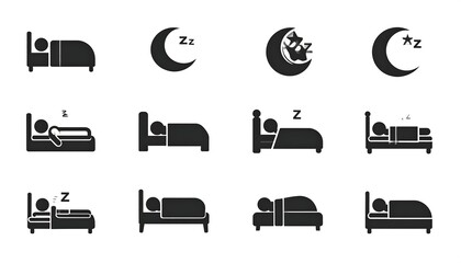 Simple black icons of people sleeping in beds and moon phases