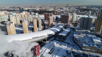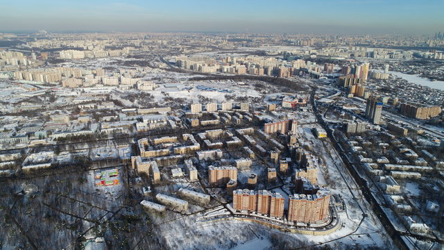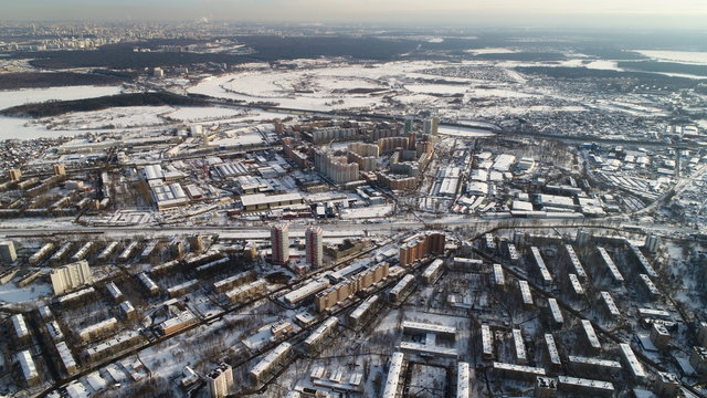 Pavshinskaya poyma district of Krasnogorsk, Moscow region, Russia. Mitino District is administrative district  of Moscow. Commuter town with very dense houses. View above.  Winter snow day