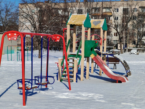 Pavshinskaya poyma district of Krasnogorsk, Moscow region, Russia. Mitino District is administrative district  of Moscow. Commuter town with very dense houses. View above. Winter snow day