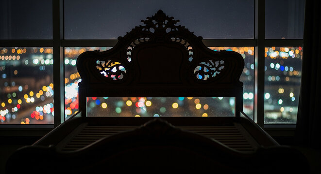 A silhouette of an ornate, decorative bed headboard positioned against a large window. Through the window, the bokeh lights of a night city create a warm, glowing background