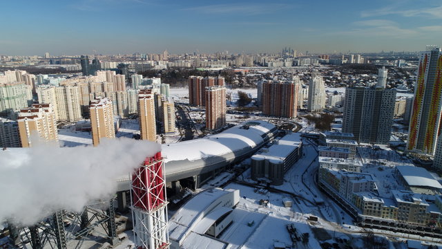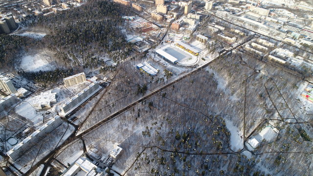 Pavshinskaya poyma district of Krasnogorsk, Moscow region, Russia. Mitino District is administrative district  of Moscow. Commuter town with very dense houses. View above.  Winter snow day