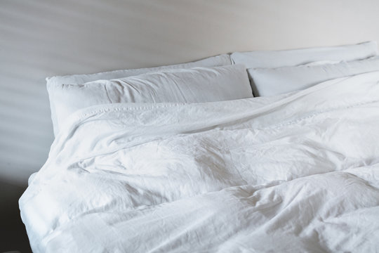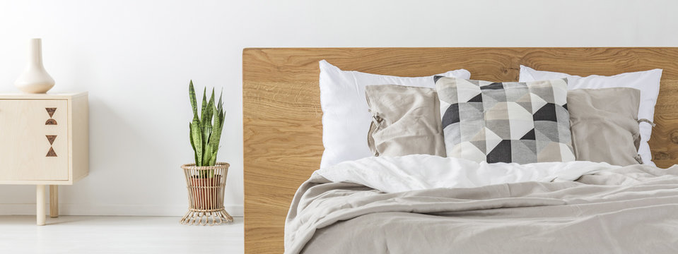 Serene minimal bedroom featuring padded low platform bed, layered linen, soft daylight