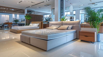 An environmentally friendly bed store with mattresses made from organic materials, showcased in a room with natural lighting and air-purifying plants