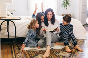 Single Mother Reading With Son And Daughter In Den In Bedroom At Home