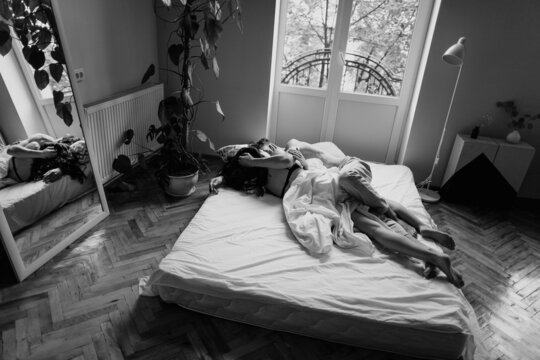 Passionate couple in love having sex on the bed at home. People in love.Concept about love, sex and lifesyle. Erotic moments.