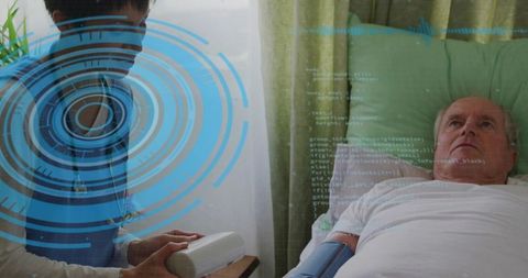 Nurse checking vitals with digital interface overlay monitoring elderly patient bedside