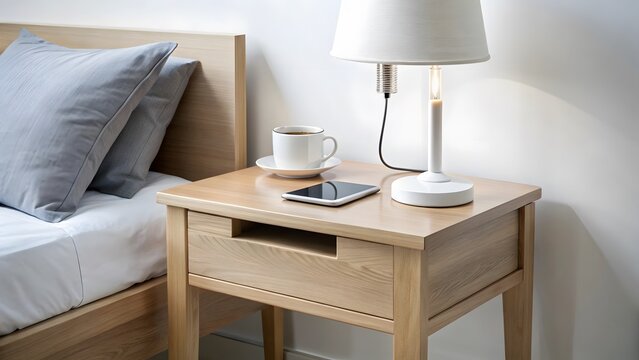 Steam rising from a cup of coffee on a wooden bedside table, warm morning light, minimalist bedroom”