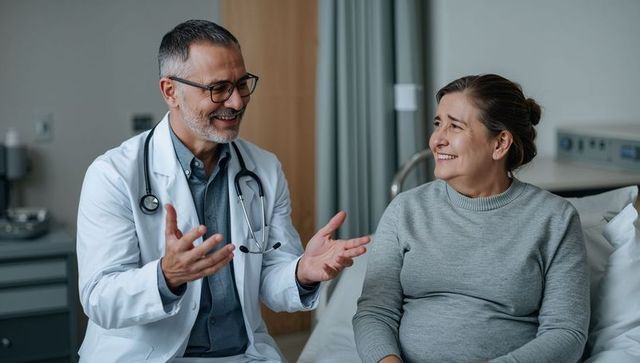 Friendly doctor consulting and reassuring smiling middle-aged patient in hospital