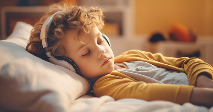 A softly glowing toy bear nightlight sits on a bedside table next to a sleeping toddler. Concept of peaceful bedtime for children.