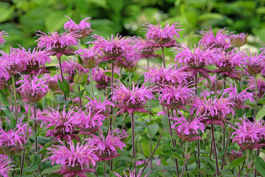 A horizontal image of the lavender flower heads of Wild Bergamot, Monarda fistulosa, growing in a meadow. Also called Bee Balm.
