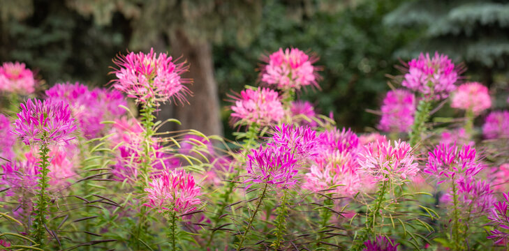 A group of tall pink garden flowers blooming in lush summer garden, framed by greenery