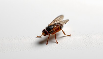A close up view of an insect, possibly a bee or a fly, perched on a surface with water droplets nearby.