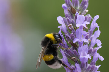 Bumblebee on lavender flower in the yard. Close up of bumblebee on lavender flower. Bumblebee pollinating blooming lavender bush with small flowers in the garden