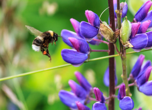 Close up of a Bumblebee on a Blue Wild Indigo or Blue False Indigo flower (Baptisia australis) pollinating on one of its flowers in the garden.