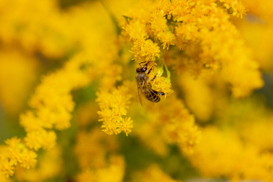 Insect on a yellow flower. A bee on a mimosa flower. Selective focus, copy space.
