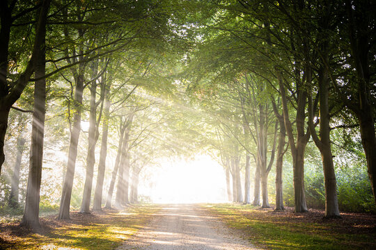 Sun rays through the main avenue of Beech trees, of the Estate Linschoten, The Netherlands.