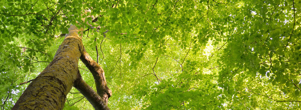 Panoramic view of the green summer beech forest. Sunlight through the mighty trees. Environmental conservation, ecology, pure nature, ecotourism. Idyllic landscape